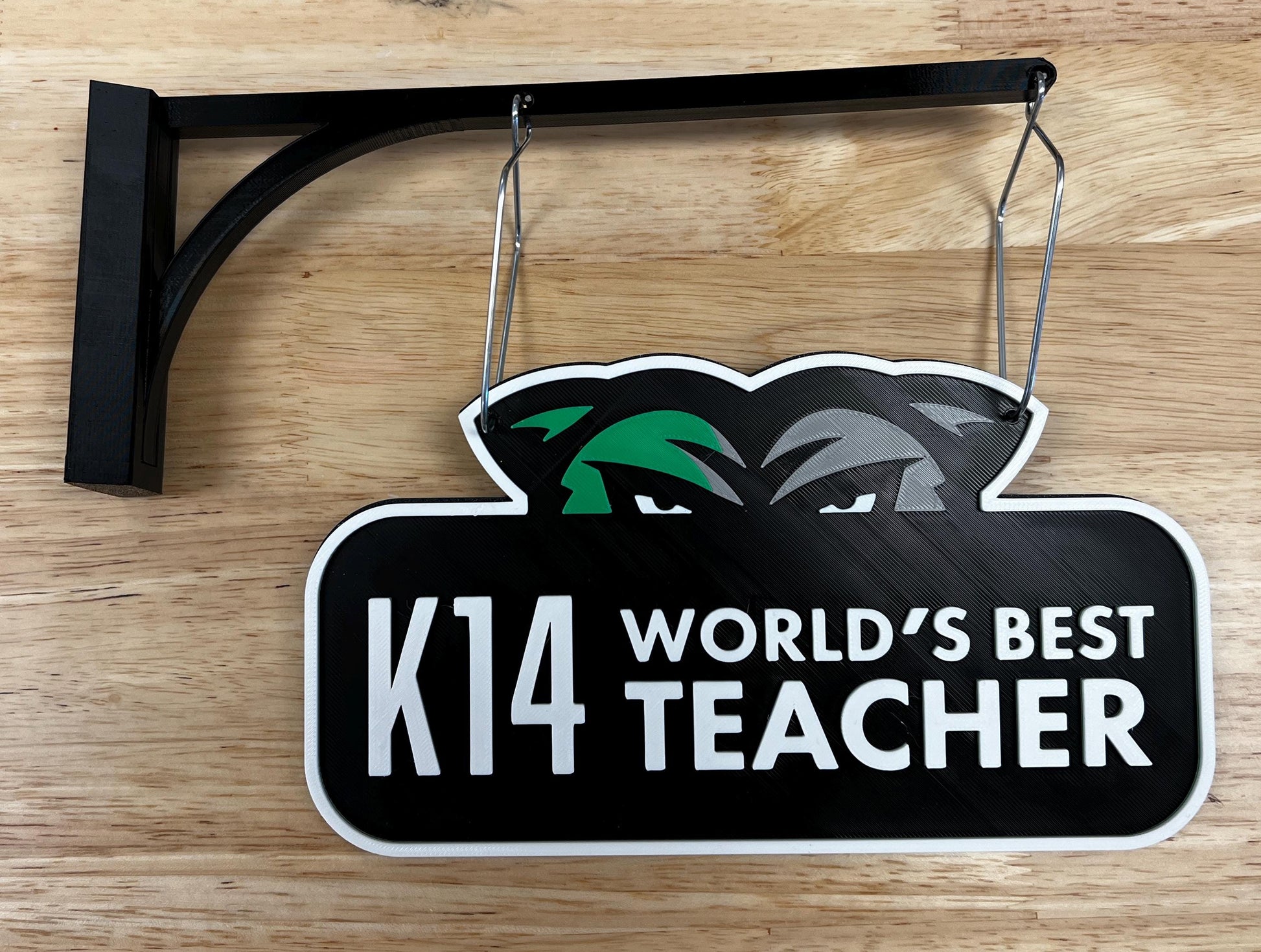 ---Double-Sided with Bracket--- A double-sided sign designed for areas without a drop-down ceiling. This version includes a bracket that can be secured with two #8 countersunk screws or one large command strips. Before applying the command strip clean the wall and base with alchohol. After adhearing the base to the wall wait 24 hours before placing in the bracket. Just ensure it’s mounted high enough to avoid students bumping into it or taking it down.